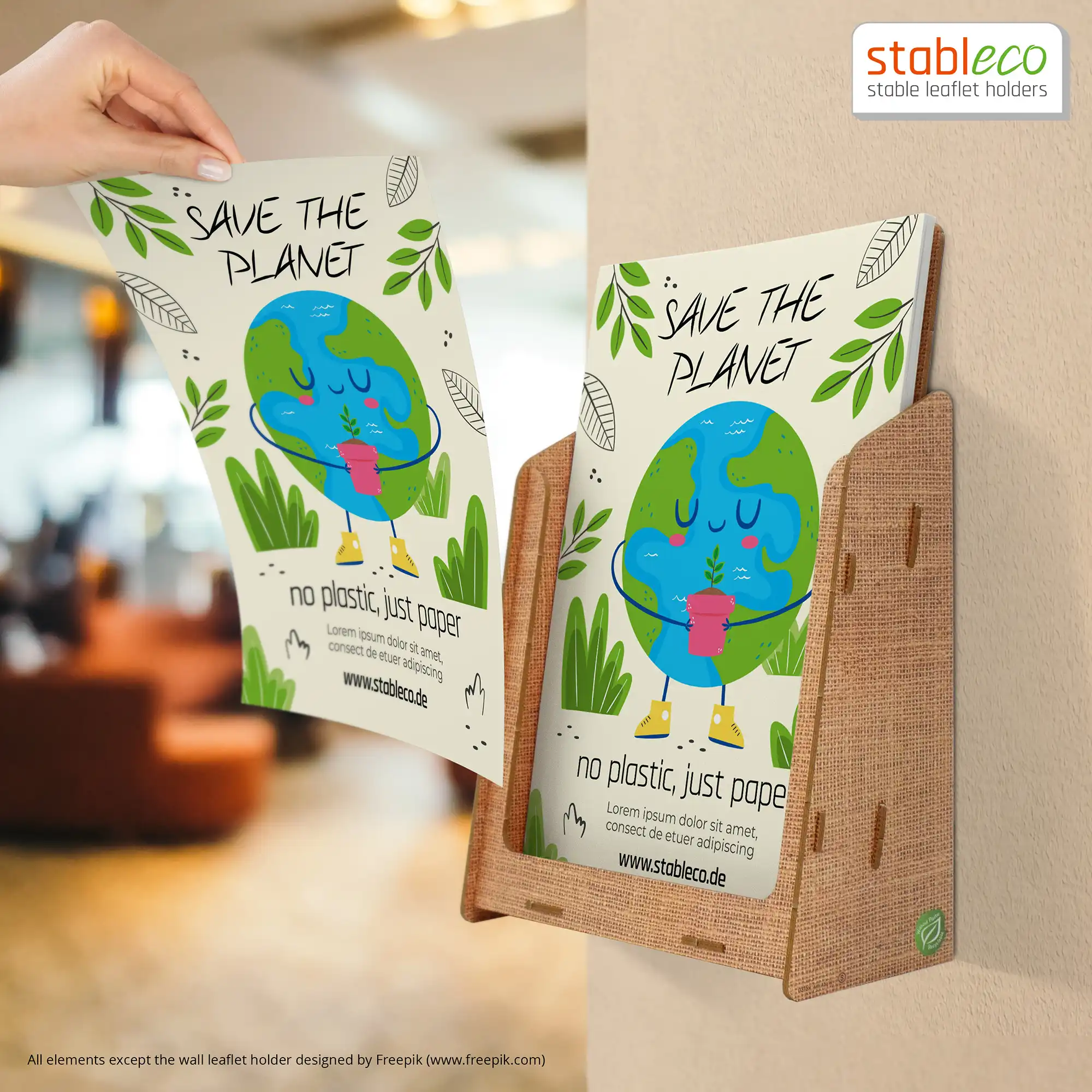 - No Plastic, just Paper! –die Wandflyerhalter und Prospektständer von stableco sind die Alternative zu Kunststoff. Die Aufsteller sind ökologisch, nachhaltig, sehr gut recyclebar. Werben auch Sie mit guten Gewissen