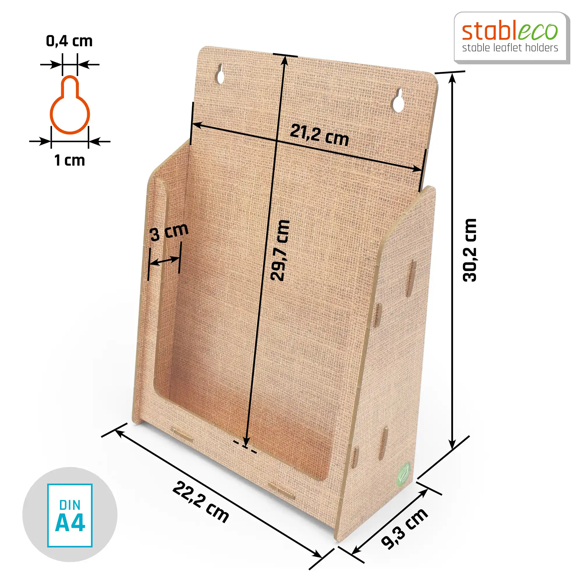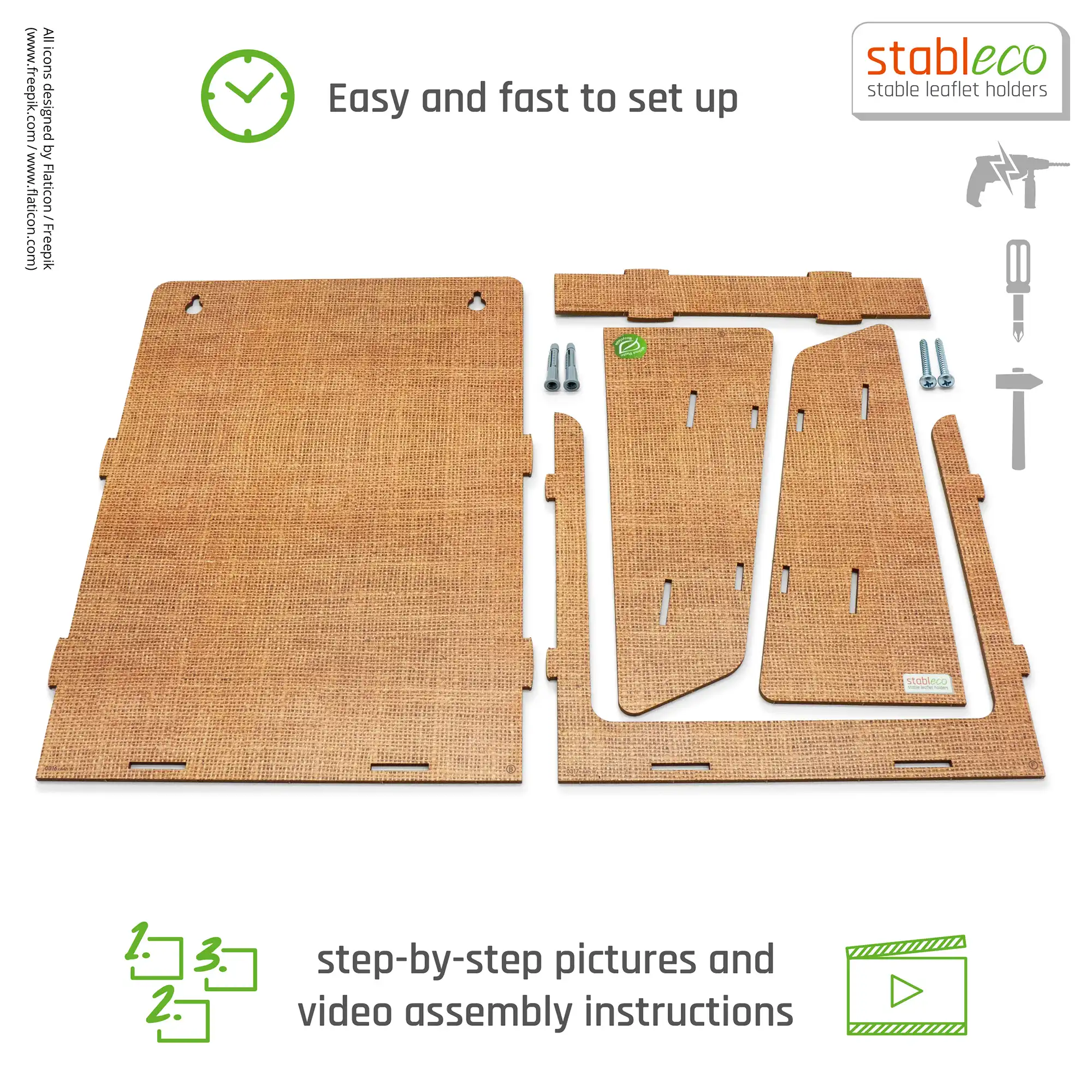 stableco ist die Marke für ökologische Kommunikation und Werbung. Unser Motto: No Plastic, just Paper! Die Wandprospekthalter sind aus einem festen, 3 mm starken, ökologischen Karton, schnell aufzubauen und wieder platzsparend zu verstauen. Die Designlinie „natural Design“ vergibt eine angenehm warme, holzähnliche Leinenoptik. Der stabile Wandprospelktständer ist für den jahrelangen Dauereinsatz im Indoorbereich konzipiert und dementsprechend beständig. Die Wandmontage ist einfach zu lösen, da die Bohrlöcher auf der Rückwand frei zugänglich zum Anzeichnen (wie eine Schablone) liegen. Es liegen 2 Schrauben und 2 Dübel der Packung bei. Die jeweilige Fülltiefe des Wandflyerhalters für Prospekte, Postkarten, Flyer, Broschüren etc. ist 3 cm.Der Flyerhalter für die Wand ist für Formate bis DIN A4 horizontal entwickelt also Breite 29,7 cm x Höhe 21 cm. Also prima als Prospektständer. Dieser Wand Postkartenhalter hat 1 Fach zum Befüllen. Eine Aufbauanleitung liegt bei. Aufbauspaß ist garantiert. Es ist befriedigend, etwas selbst gemacht zu haben. Also los, für unsere Umwelt, vermeiden Sie Plastik. Es ist der einzige Wandflyerständer aus ökologischem Karton! Werben Sie mit gutem Gewissen. stableco
