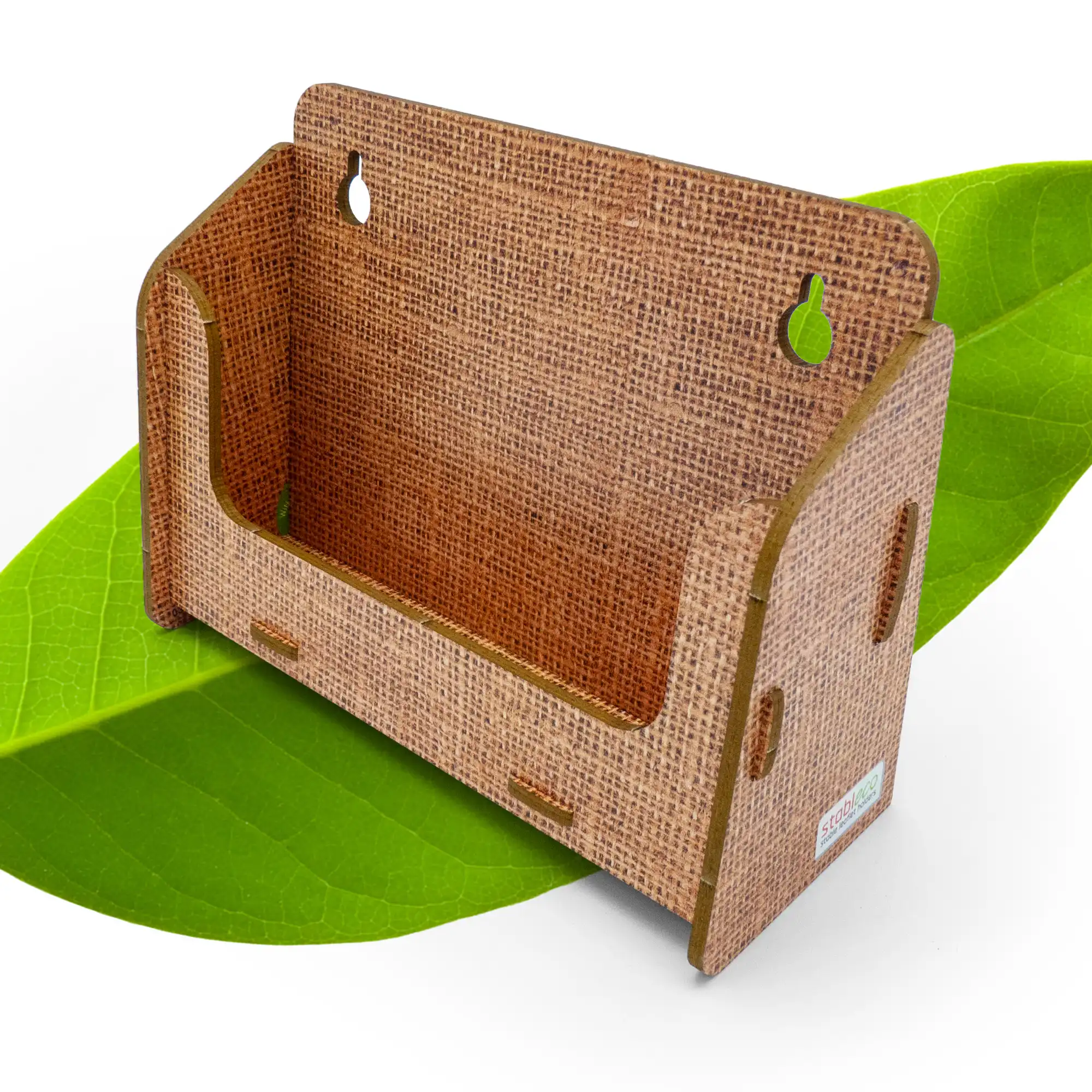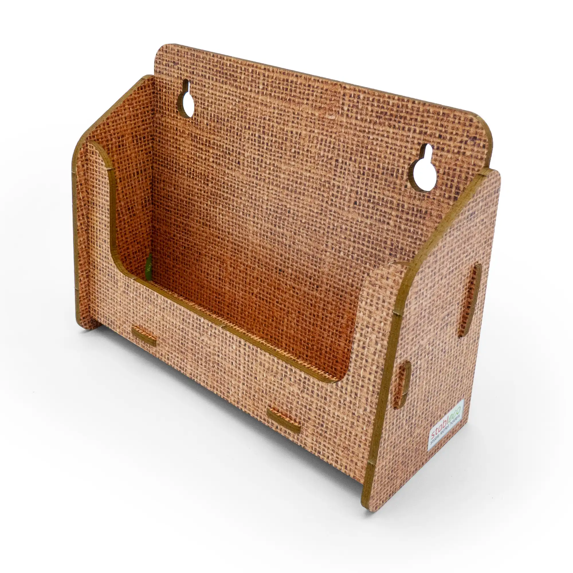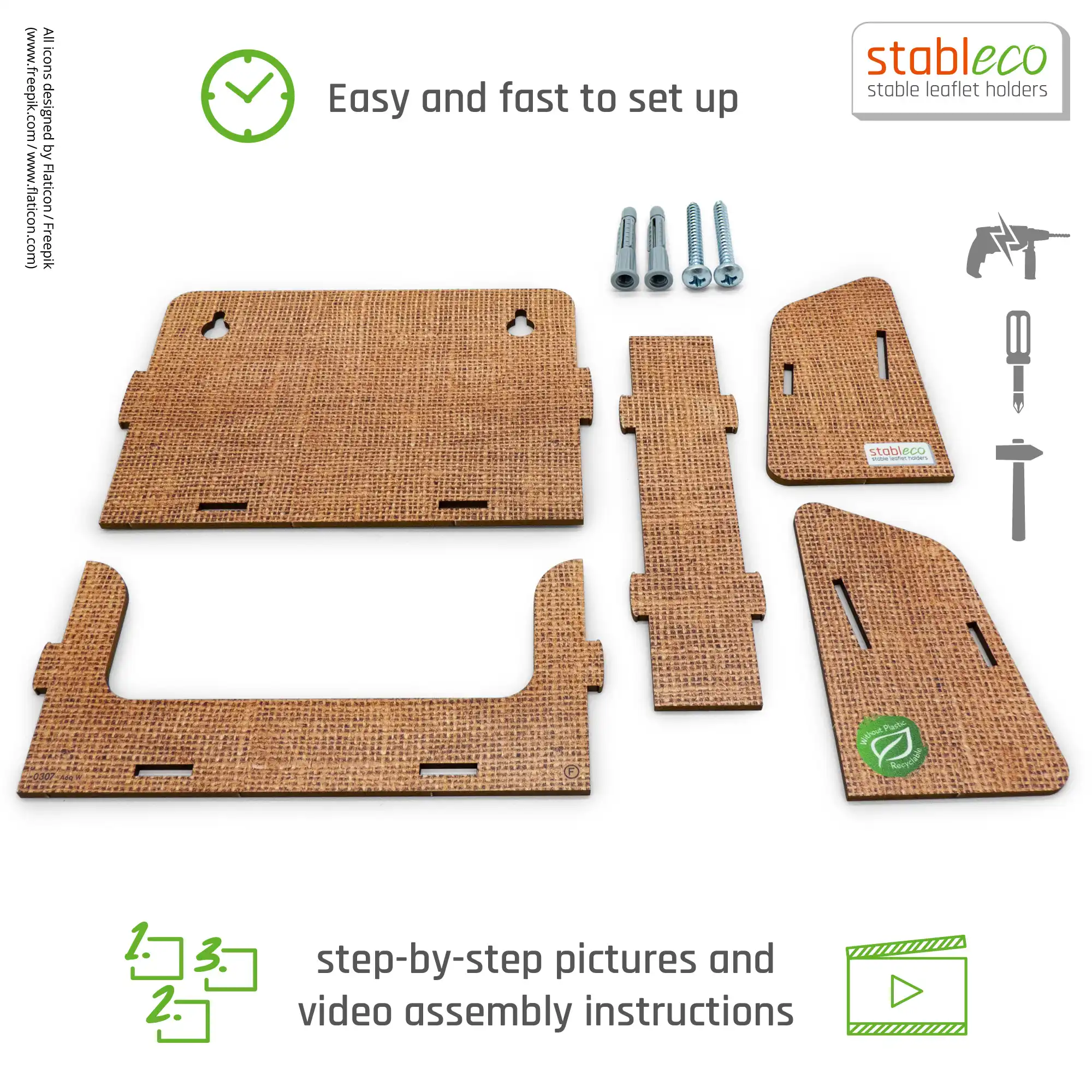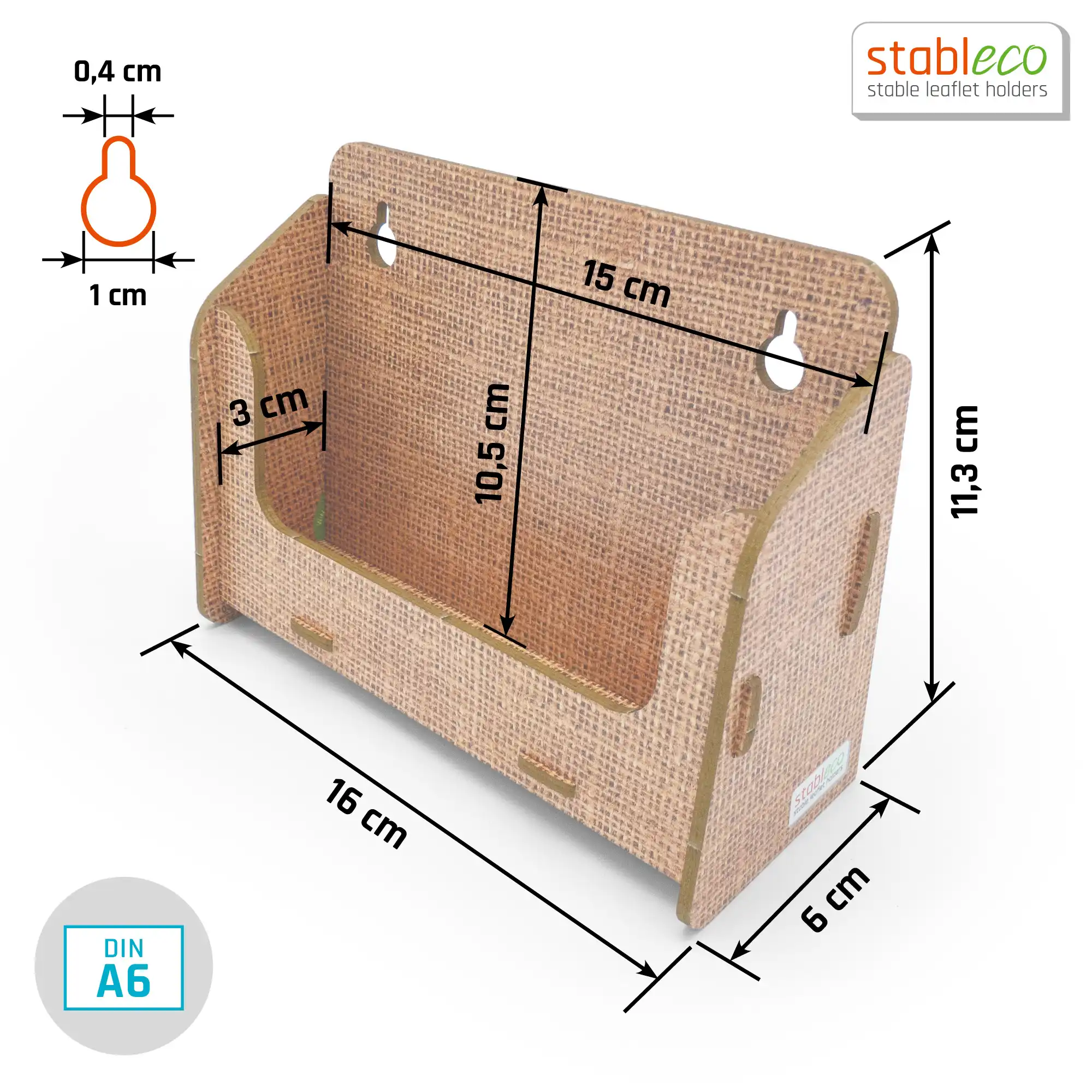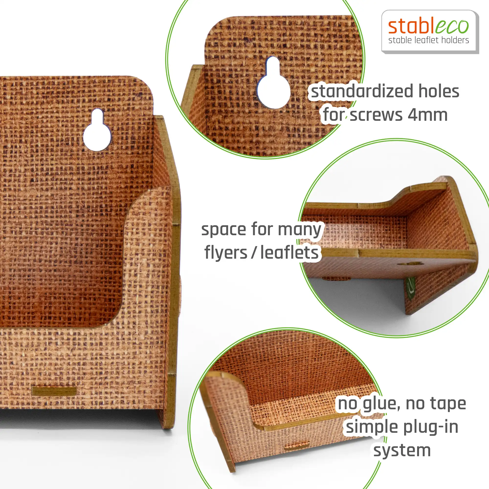 stableco ist die Marke für ökologische Kommunikation und Werbung. Unser Motto: No Plastic, just Paper! Die Wandprospekthalter sind aus einem festen, 3 mm starken, ökologischen Karton, schnell aufzubauen und wieder platzsparend zu verstauen. Die Designlinie „natural Design“ vergibt eine angenehm warme, holzähnliche Leinenoptik. Der stabile Wandprospelktständer ist für den jahrelangen Dauereinsatz im Indoorbereich konzipiert und dementsprechend beständig. Die Wandmontage ist einfach zu lösen, da die Bohrlöcher auf der Rückwand frei zugänglich zum Anzeichnen (wie eine Schablone) liegen. Es liegen 2 Schrauben und 2 Dübel der Packung bei. Die jeweilige Fülltiefe des Wandflyerhalters für Prospekte, Postkarten, Flyer, Broschüren etc. ist 3 cm.Der Flyerhalter für die Wand ist für Formate bis DIN A6 horizontal entwickelt also Breite 14,8 cm x Höhe 10,5 cm. Also prima als Postkartenständer. Dieser Wand Postkartenhalter hat 1 Fach zum Befüllen. Eine Aufbauanleitung liegt bei. Aufbauspaß ist garantiert. Es ist befriedigend, etwas selbst gemacht zu haben. Also los, für unsere Umwelt, vermeiden Sie Plastik. Es ist der einzige Wandflyerständer aus ökologischem Karton! Werben Sie mit gutem Gewissen. stableco