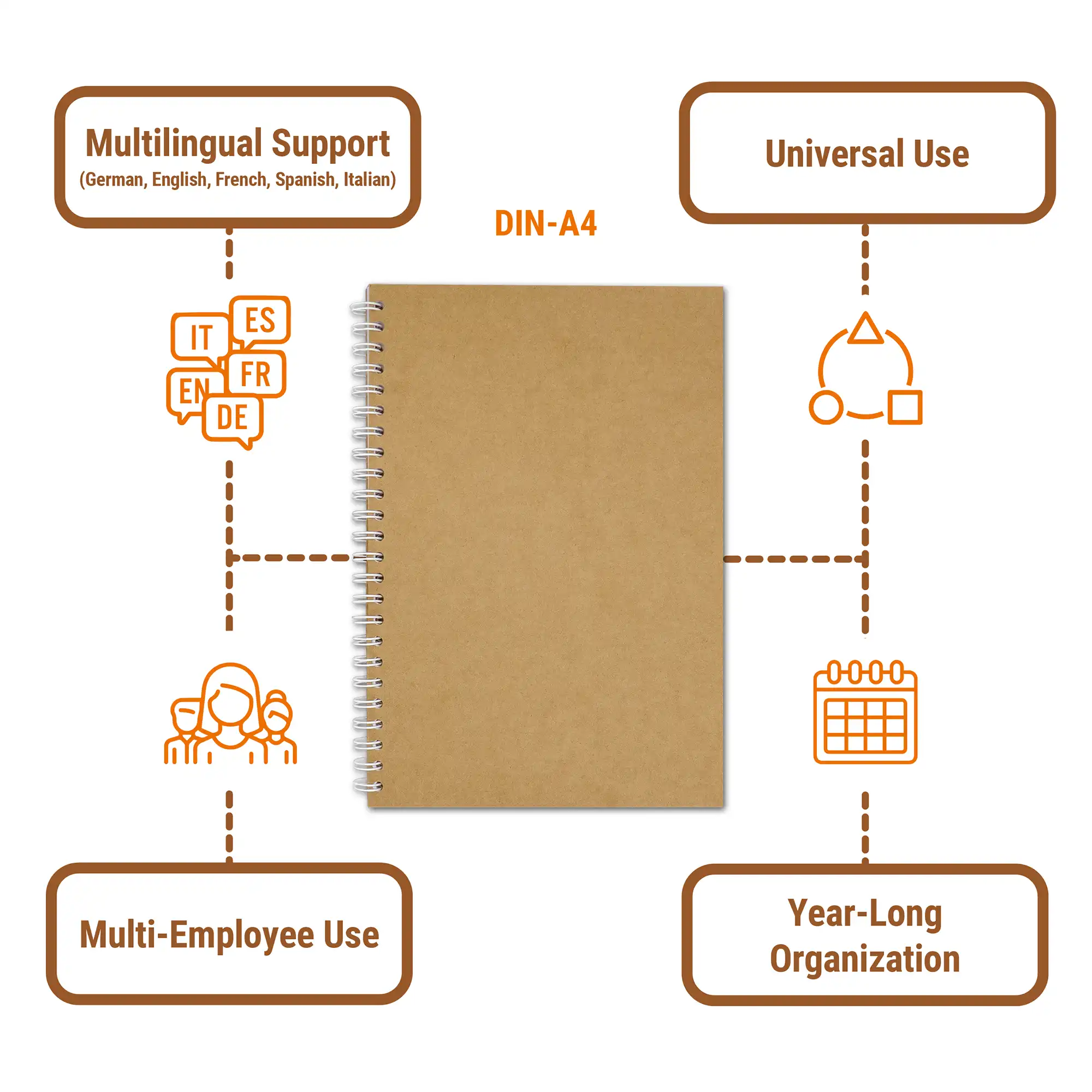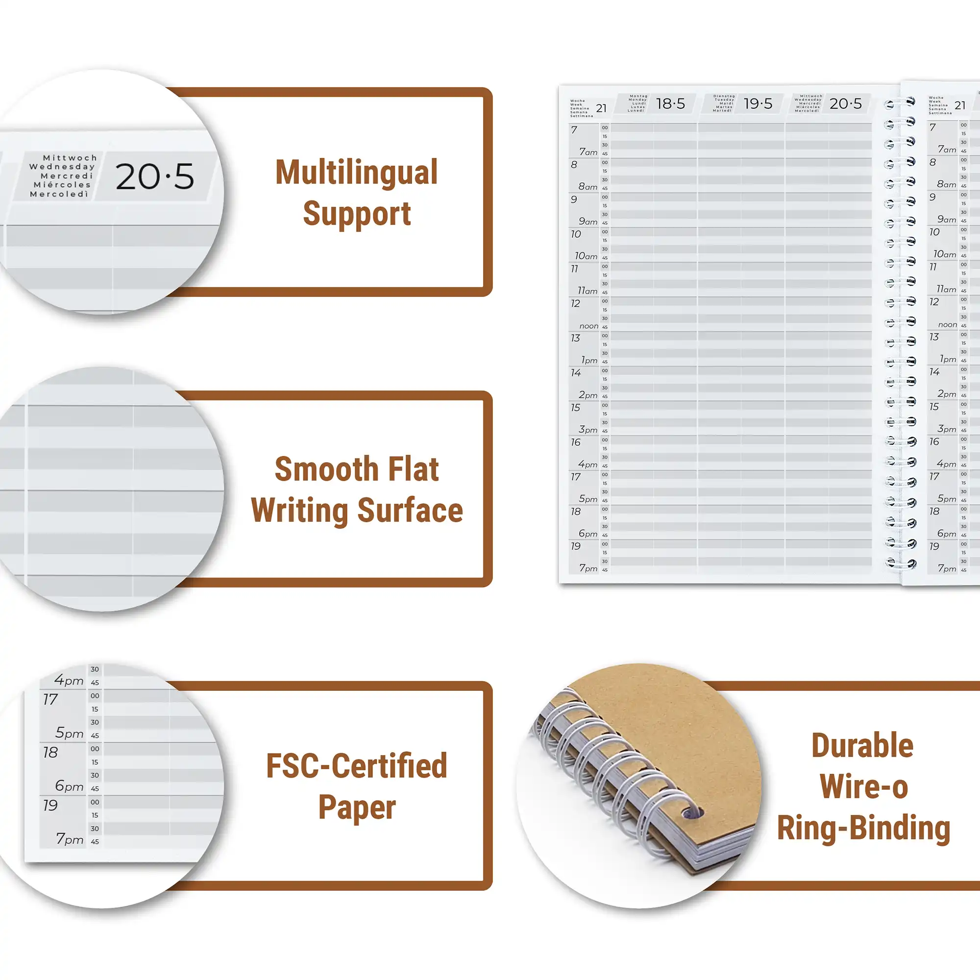 Termine nicht erfasst? Vergessen?? Mit dem KOCHDIALOG Wochenplaner Terminbuch für 2026 haben Sie alles im Blick. Das professionelle, alltagstaugliche Bestellbuch führt Sie mit Wochenübersicht einfach durch das Jahr und Ihr Bestellmanagement funktioniert. Die Wochen Agenda können Sie universell einsetzen, für Friseur, den Salon, die Praxis, das Kosmetikstudio, Nageldesign, Schönheitssalon, die Arztpraxis, Physio, Therapeuten und und… Wählen Sie ganz nach Ihren Bedürfnissen Ihre Variante aus. Der KOCHDIALOG Termin Wochenkalender passt sich Ihren Vorstellungen an. Die Jahreszahlen als auch das jeweilige Datum ist voreingetragen. Pro Tag steht eine unterteilte Spalte zur Verfügung, die Sie quasi für 2 Mitarbeiter nutzen können. Der Wochenplaner aufgeschlagen gibt Ihnen einen Überblick über die ganze Woche. Samstag und Sonntag sind innerhalb der letzten Spalte verkürzt angelegt. Dieser Termin Wochenplaner für Praxis, Friseur, Studio etc. hat eine 15 Minuten Taktung = 15 Minuten pro Zeile. Neben einem stylischem, funktionalen Design bietet das Bestellbuch ein super Aufschlagverhalten. Durch die stabile Ringbindung liegt es in aufgeklappten Zustand ganz gerade auf dem Tisch. Das Eintragen der Termine lässt sich ganz easy, mit nahezu allen gängigen Stiften wie Kugelschreiber, Bleistift… vornehmen. Der Kalender ist 5-sprachig angelegt, english, deutsch, französisch, spanisch, italienisch. Das Inhaltspapier ist ein umweltfreundliches FSC Papier. Der Umschlag ist im klassischen KochDialog Design, einem haltbaren „nature-eco“ Karton im hell-natürlichen Braunton. Der Wochenkalender ist größer als DIN A4 und bietet in dem Format 21 x 31,8 cm mehr Platz zum Ausfüllen! Also ganz egal ob Sie den KochDialog Wochenplaner als Praxisplaner, Friseurplaner, Salonplaner, Mitarbeiterplaner oder sogar als Auftragsbuch nutzen wollen, in dieser Varianten haben Sie eine super Wochenübersicht für bis zu 2 Mitarbeiter. Planen Sie mit KOCHDIALOG!